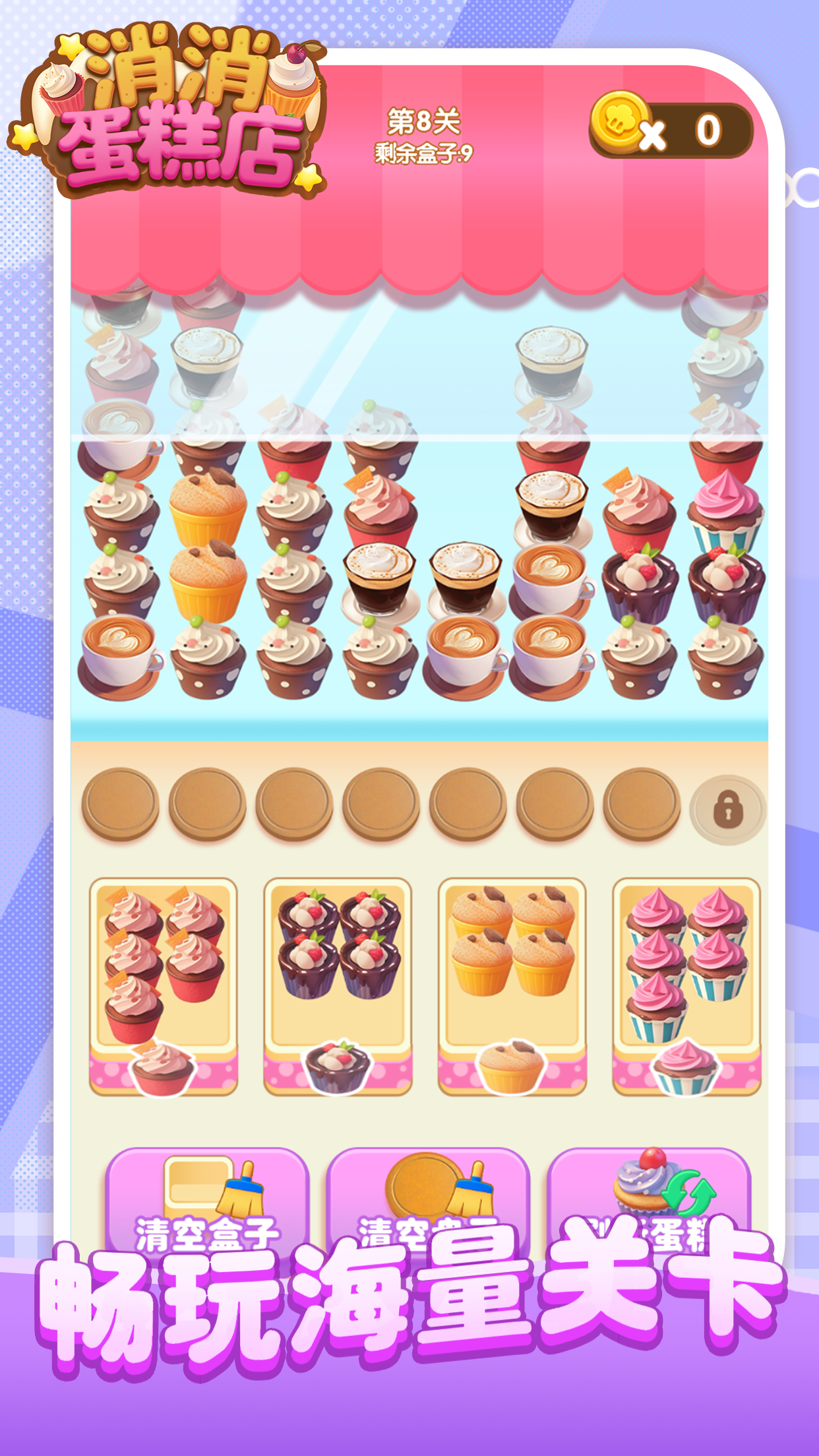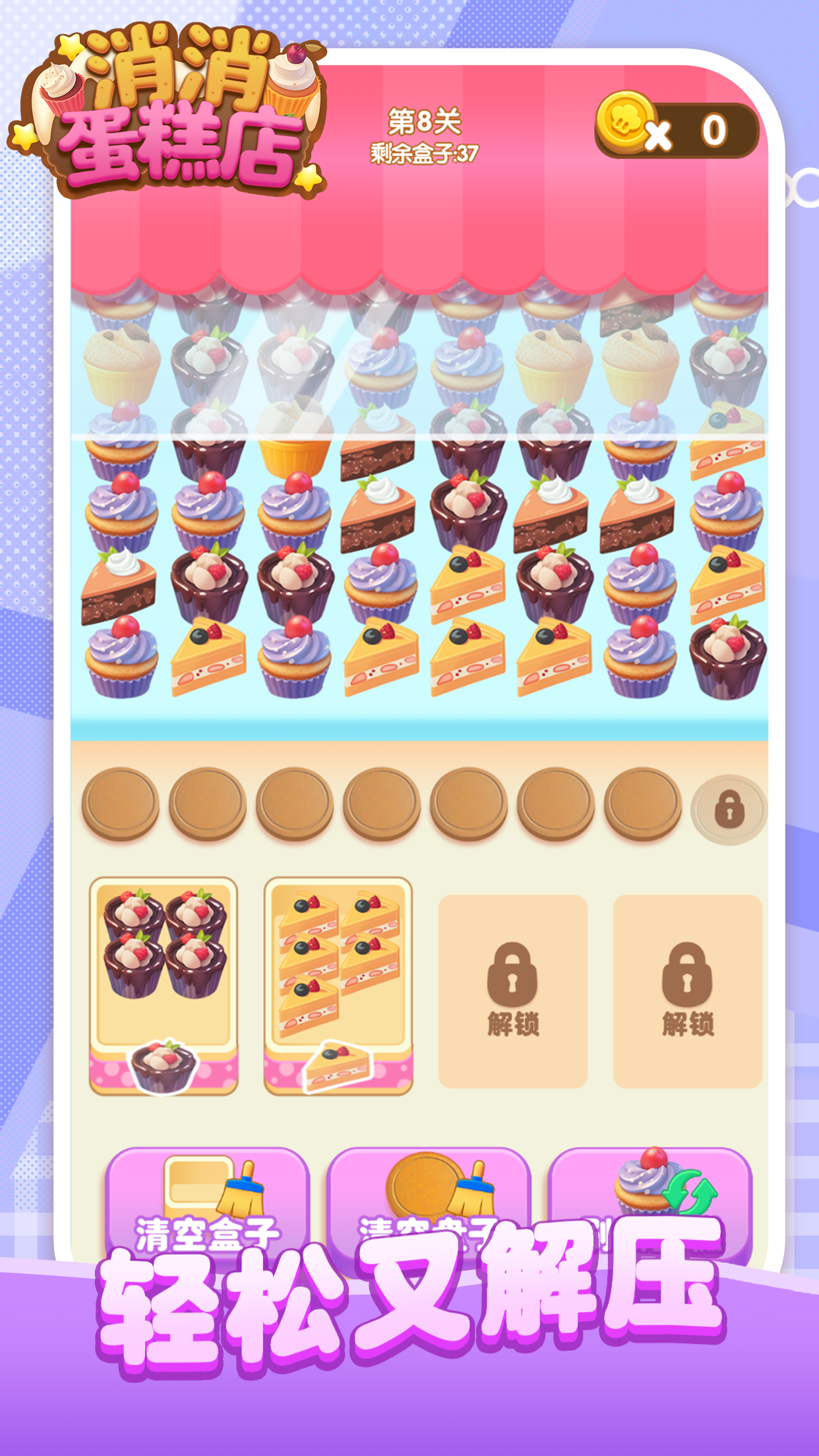 。按照盒子的需求把对应的蛋糕装满即可消除 ,搭配轻松愉快的背景音乐,游戏方法为点击下层的蛋糕 ,按照盒子的需求准确地装满蛋糕,还需要策略性地安排蛋糕的顺序